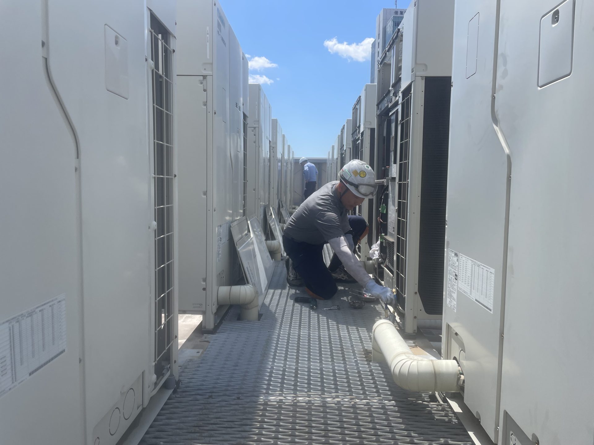 空調設備は停止させず、動作させたままで短時間で工事を行います。専用工具でオイルを圧入する施工で、設備本体への施工などは行いません。