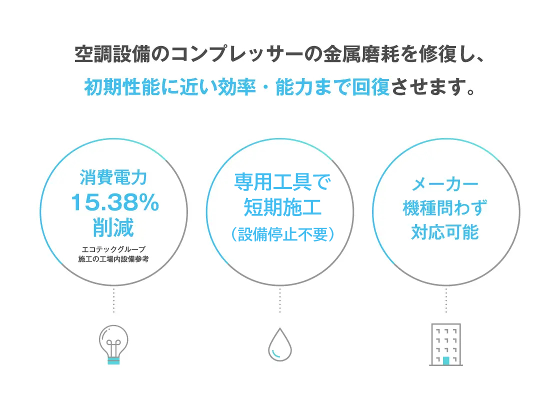 コンプレッサー内部の金属摩耗や傷などの経年劣化を、同じ金属成分を再結晶させることで修復し、初期性能を回復させます。
