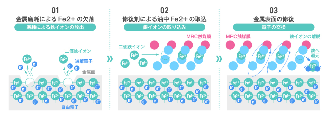 ベースオイルをキャリアとして利用し、金属修復触媒の働きで騒音や回転振動を減らし、圧縮性能を回復します。