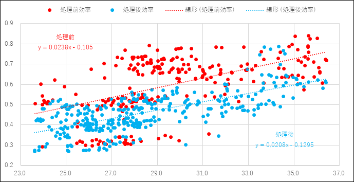 (縦軸=1kJ/kgあたりの消費電力量・横軸=外気温度)